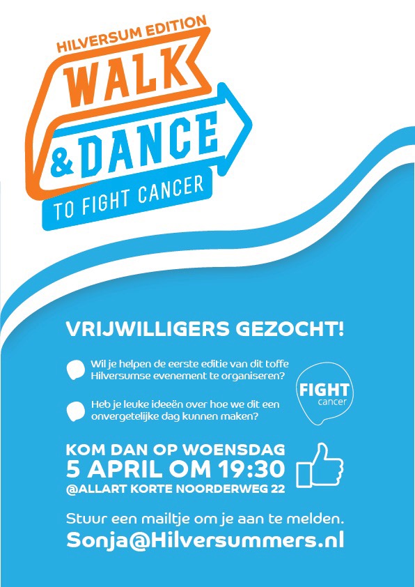 Stel je voor... dat we met z'n allen een tof evenement organiseren om heel veel geld in te zamelen voor kankeronderzoek. Samen met de in Hilversum gevestigde stichting, Fight cancer, willen wij een Walk & Dance to Fight cancer organiseren in Hilversum in oktober 2023. Een gesponsorde loop van 25km (of 5km) met aan het einde een mooi dansfeest om de prestaties van de deelnemers te vieren! De wandeling zal door de mooiste plekjes van Hilversum gaan, en we zijn op zoek naar een ongewone en onvergetelijke Hilversumse locatie om het evenement af te sluiten. We willen het een evenement maken door Hilversummers voor Hilversummers. Deze ziekte raakt zoveel mensen (omdat ze het zelf gehad hebben, of omdat ze iemand kennen die het gehad heeft) dat we iedereen de mogelijkheid willen geven om bij te dragen - als deelnemer of als donateur, als sponsor of als vrijwilliger - om het evenement mogelijk te maken. We zijn op zoek naar mensen om ons team te versterken. Vind je het leuk om de social media bij te houden, is het voor jou een uitdaging om sponsors te werven of is organisatie en veiligheid helemaal jou ding? Of wil je graag op een andere manier bijdragen? Dan zijn we op zoek naar jou! Doe jij met ons mee? Neem dan contact met me op via sonja@hilversummers.nl. Samen gaan we er een fantastisch evenement van maken!